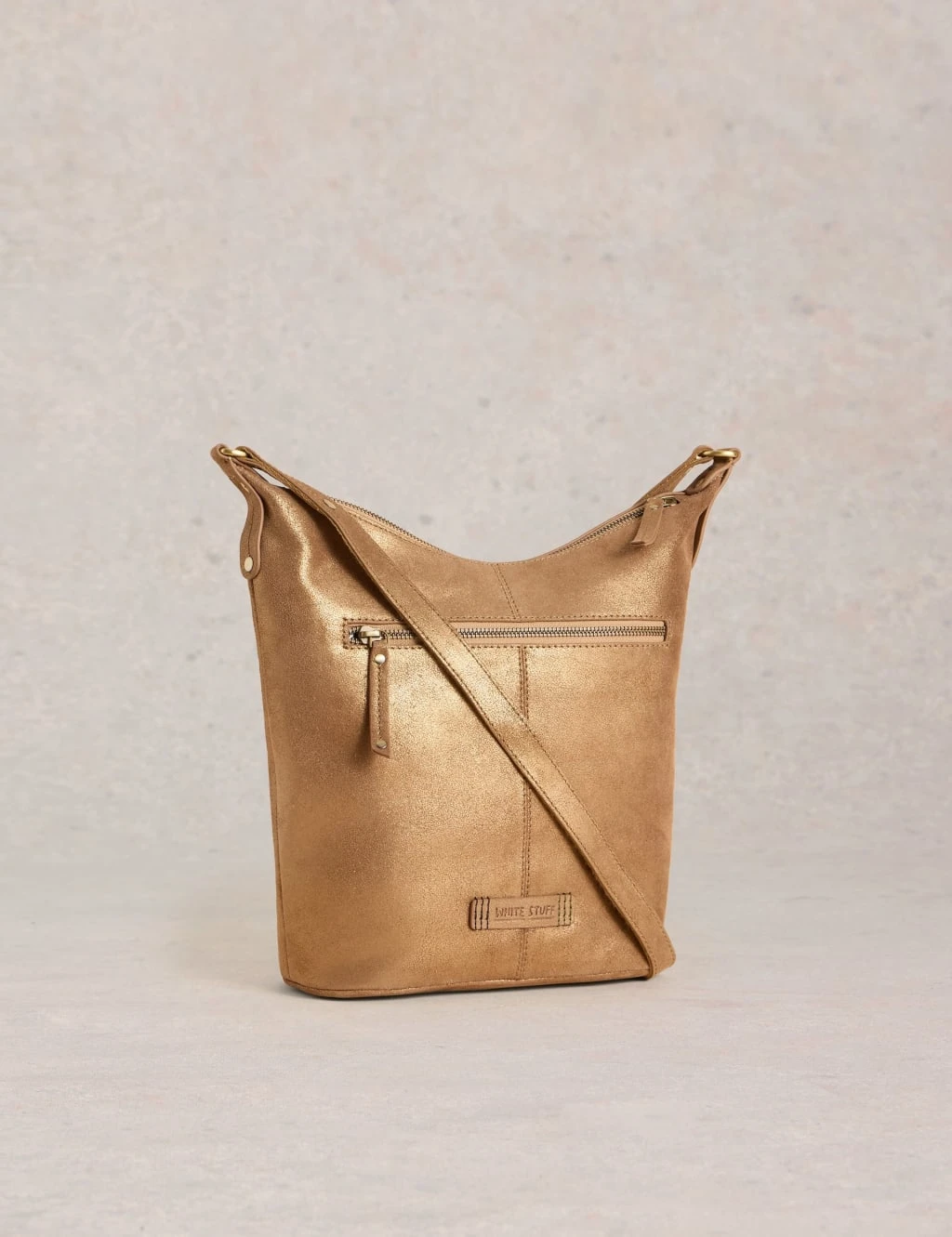 This cross-body bucket bag from White Stuff is crafted from metallic leather for a glam yet wearable look. It features a zipped main compartment and a smaller zipped pocket on the back, both lined for extra protection. Matching gold-tone hardware completes the stand-out piece.