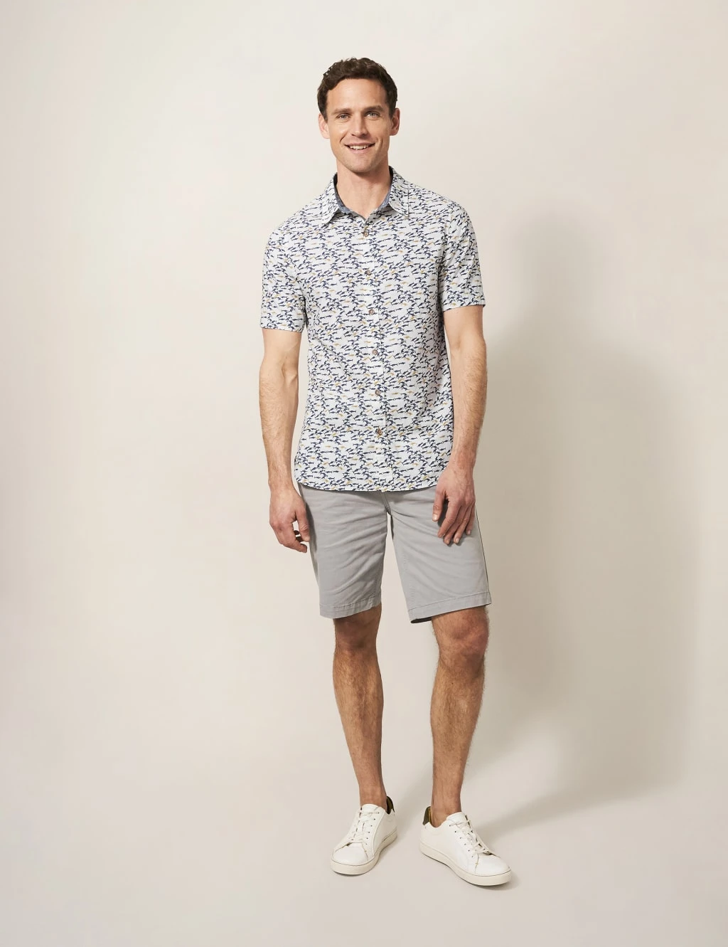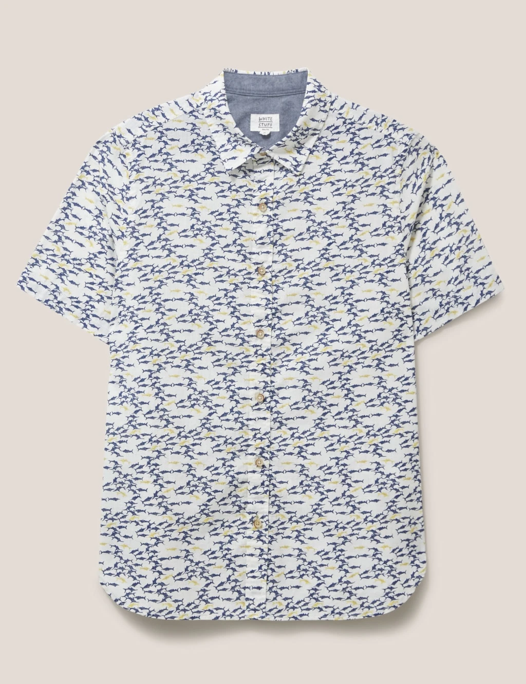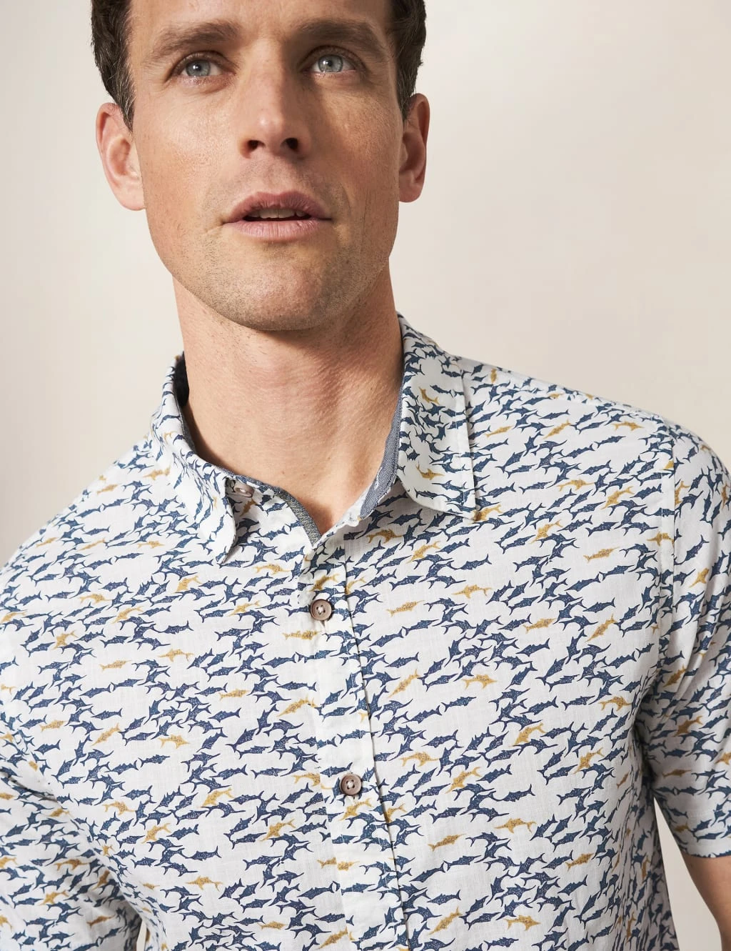 Keep your look cool and casual with this pure cotton shirt from White Stuff. It’s crafted in a regular fit, with short sleeves, a classic collar and mock-horn button fastenings. There’s a contrast trim on the inside of the collar and placket for a stylish touch. This piece is complete with a striking all-over print of swimming sharks.