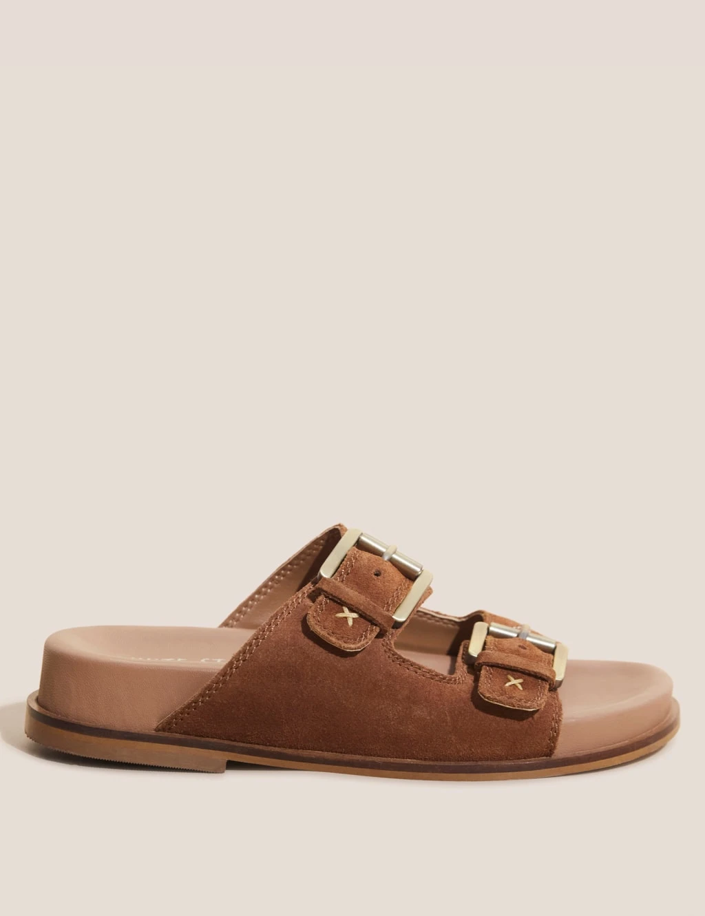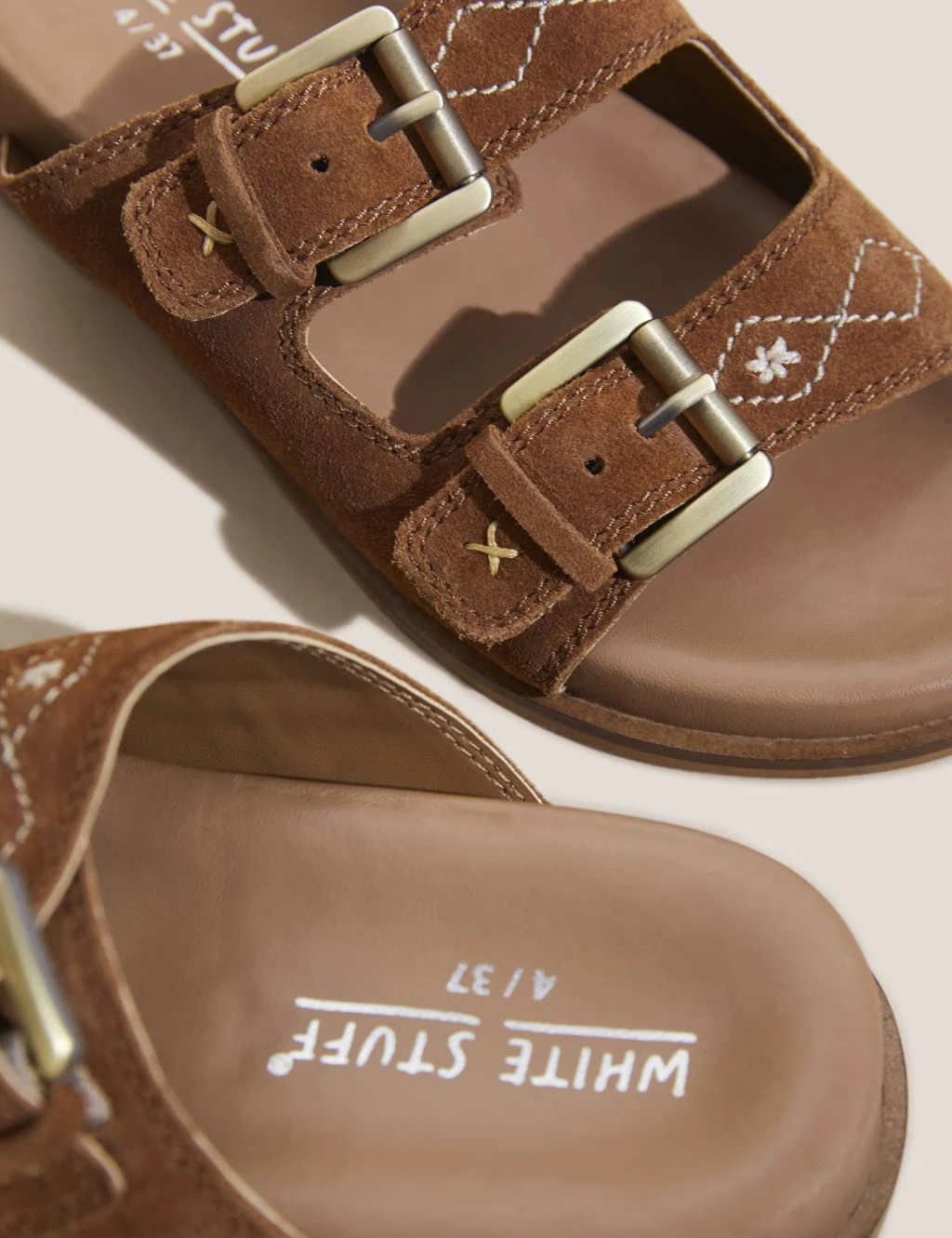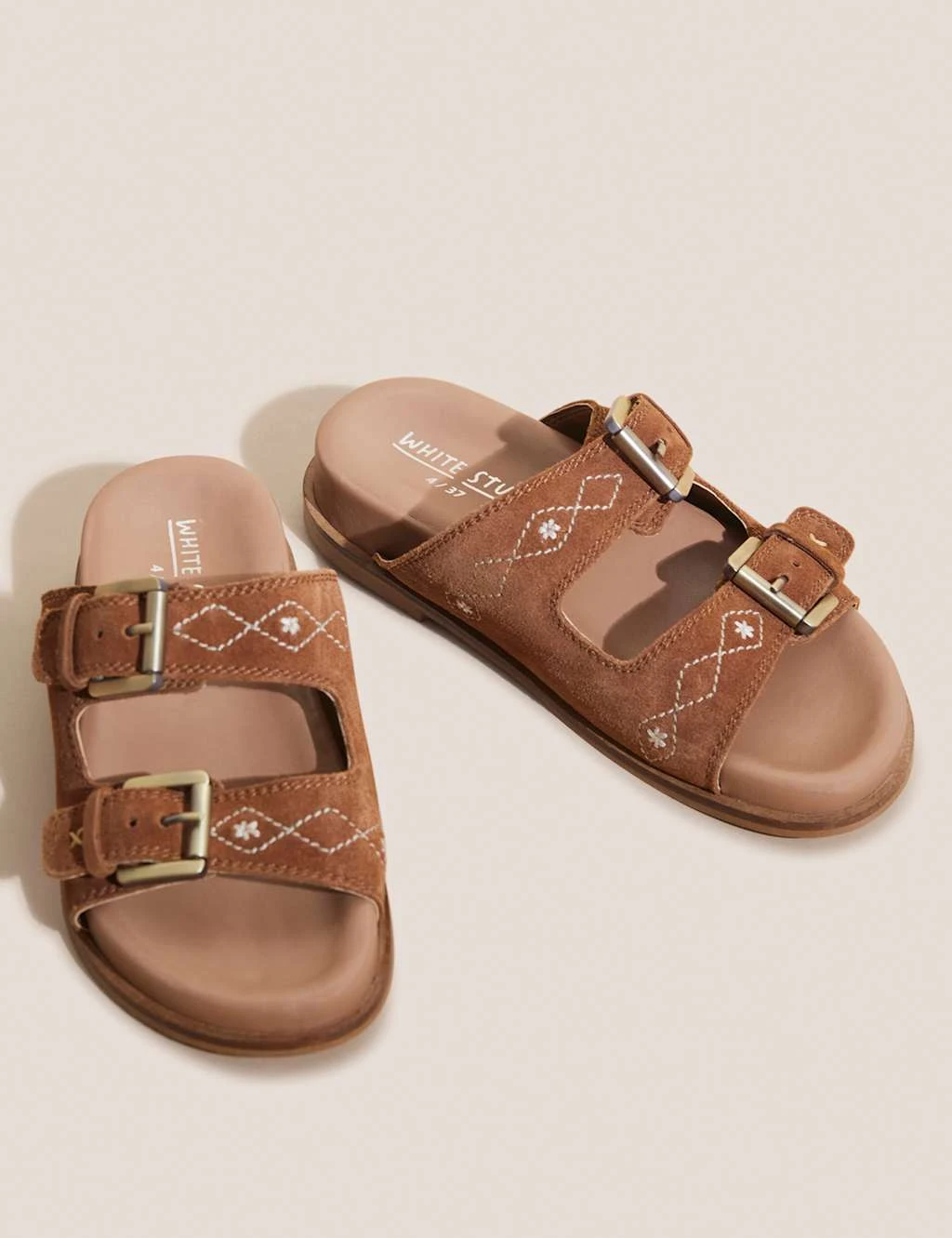 Add a boho-inspired twist to warm-weather outfits with these suede sandals from White Stuff. They have a slip-on silhouette and a supportive and comfy flat heel. Contrast embroidery on the adjustable buckle straps adds a stylish twist.
