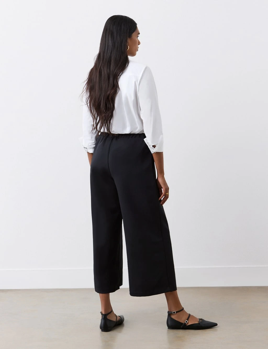 These Finery London trousers are crafted from lightweight fabric that drapes elegantly for a sophisticated look. They have a flattering wide-leg cut that finishes at the calves for a modern shape. An elasticated waist at the back ensures comfort all day long, while side pockets add a practical touch.