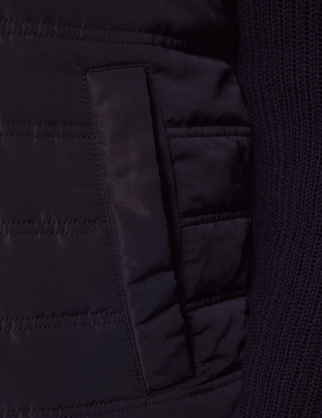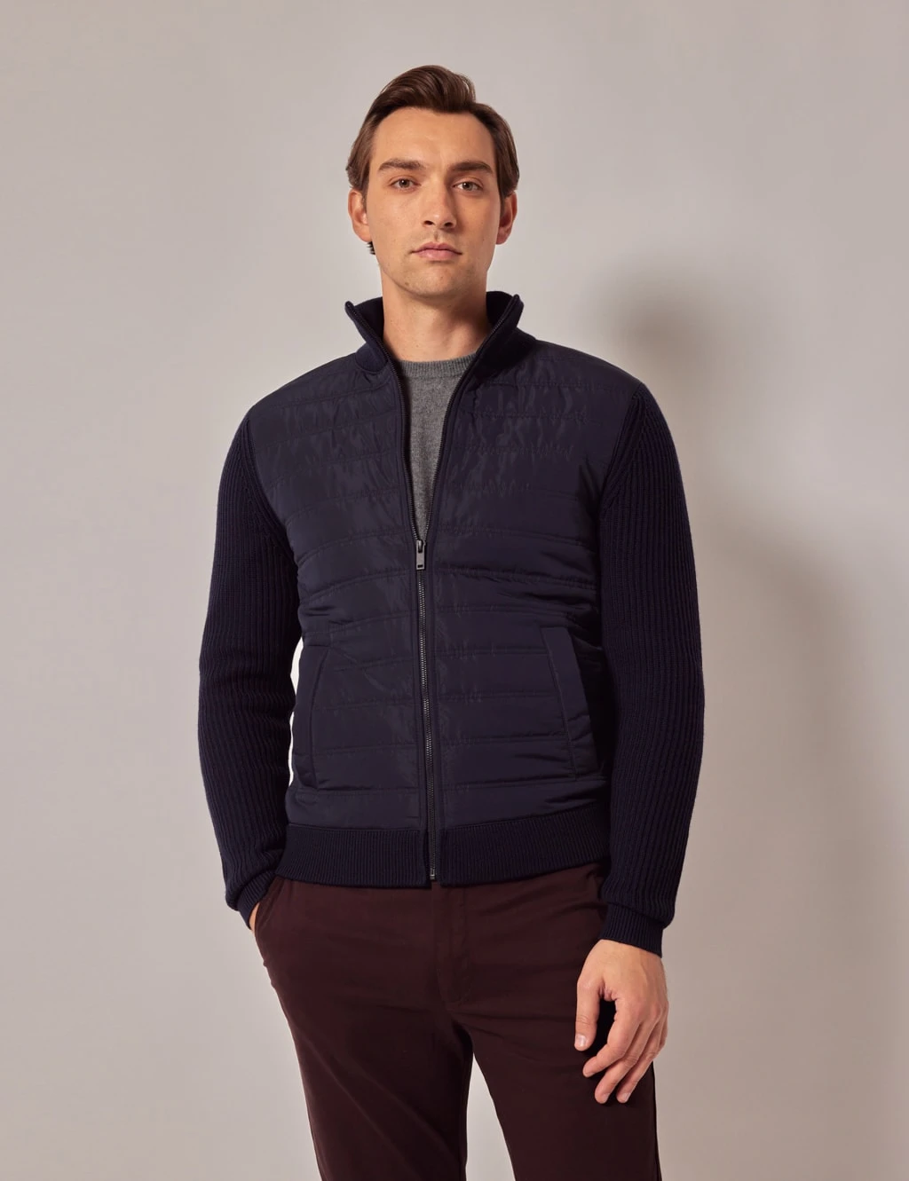 Layer up on chilly days with this hybrid jacket by Hawes & Curtis. It’s made in a regular fit with a cosy funnel neck and a secure zip-through front. The padded body contrasts with the knitted sleeves and back to create a textured look.